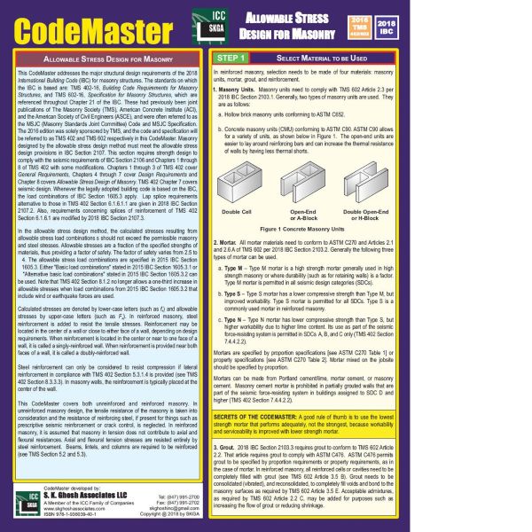 This 8-page laminated reference guide provides an easy-to-follow 9-step procedure for the allowable stress design of masonry in accordance with the 2018 IBC and the TMS 402-16. Masonry design by the allowable stress design method must meet the allowable stress design provisions in IBC Section 2107, which requires the design to comply with seismic requirements of IBC Section 2106 and Chapters 1 through 8 of TMS 402-16 with some modifications. Illustrations are provided for ease of understanding, along with worked out examples.